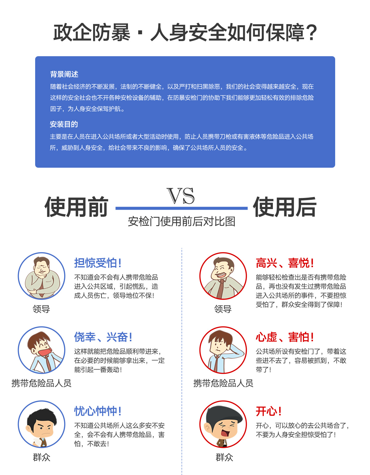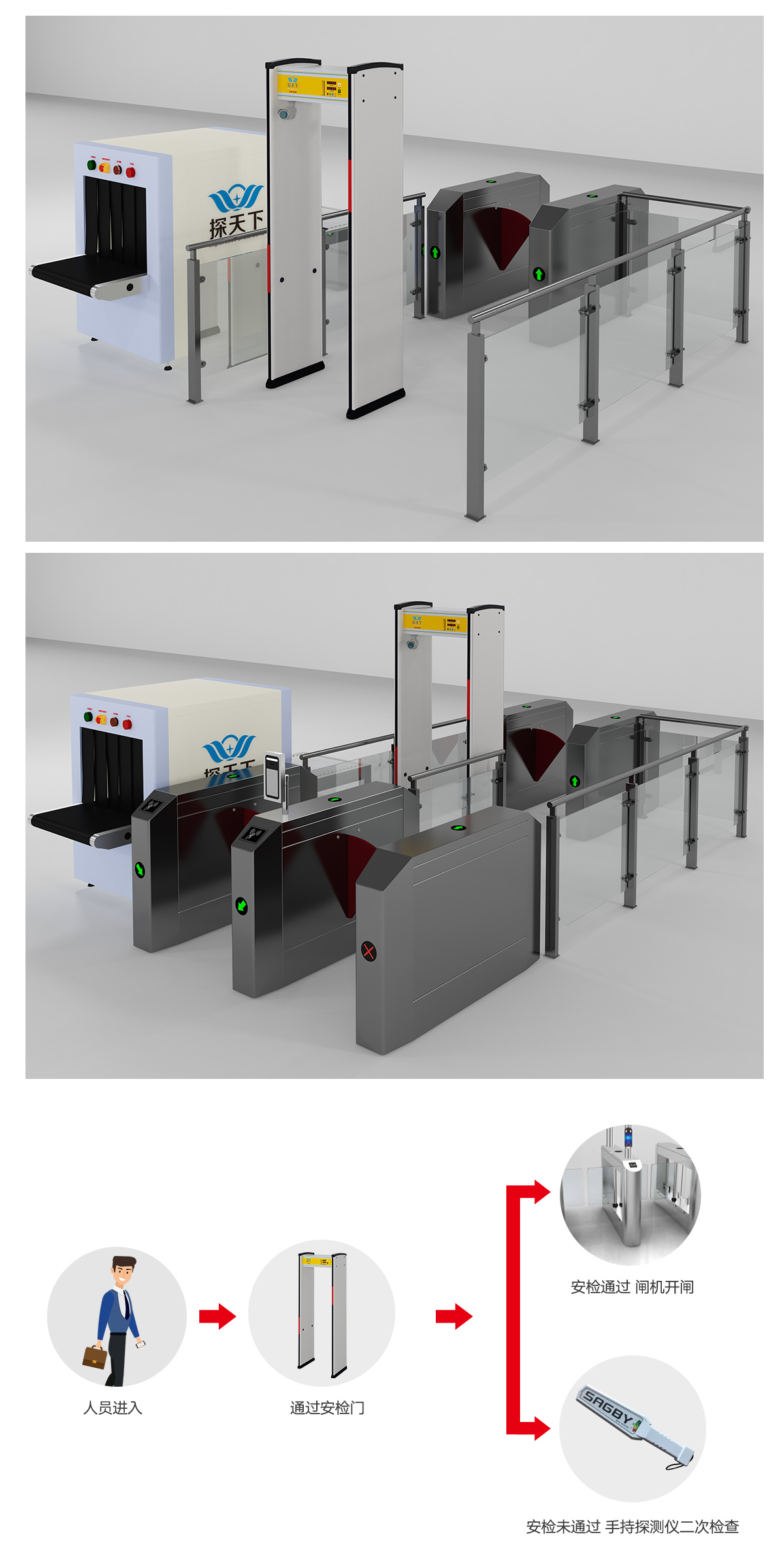 進入政企單位首先需要對人員進行身份登記。證件查驗、登記:受檢人員應當持居民身份證、駕駛證等能夠證明持證人身份的有效證件,并由安檢人員對受檢人員的姓名、證件種類、號碼等進行查驗、登記。可使用身份證識別儀,能夠自動識別、儲存受檢人員的信息。然后進入安檢通道進行人身、物品到檢查。受檢人員應當將隨身攜帶包裹放入X光安檢機檢查,并將隨身攜帶物品放在物品框內,接受X光安檢機的檢測。
