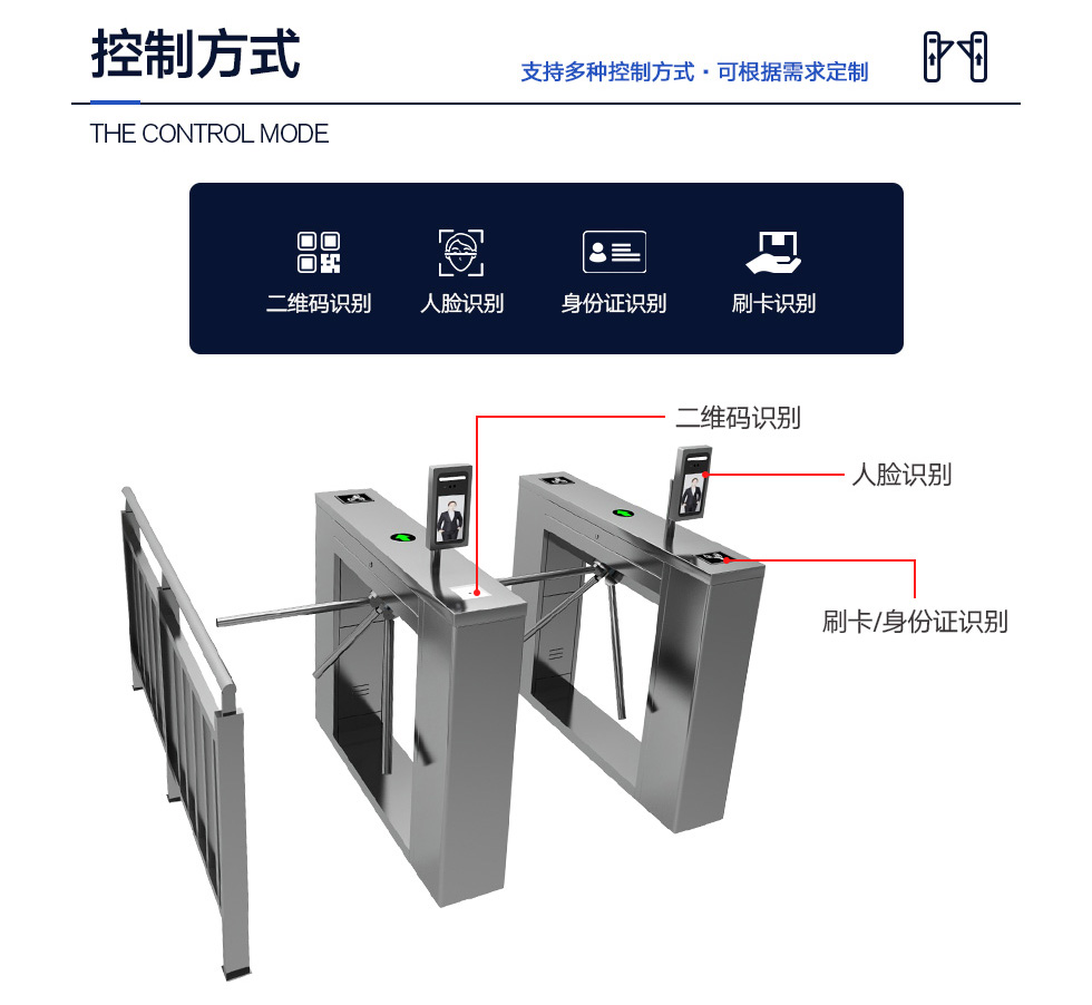 4) 具有多種工作模式可供選擇,即可雙向讀卡,也可一邊讀卡、另一方向禁行,一邊讀卡、另一方向自由通行,且閘機工作模式可通過主板菜單進行設定。