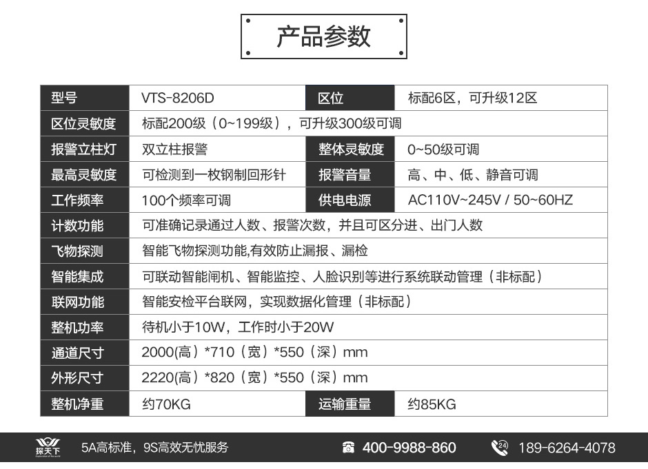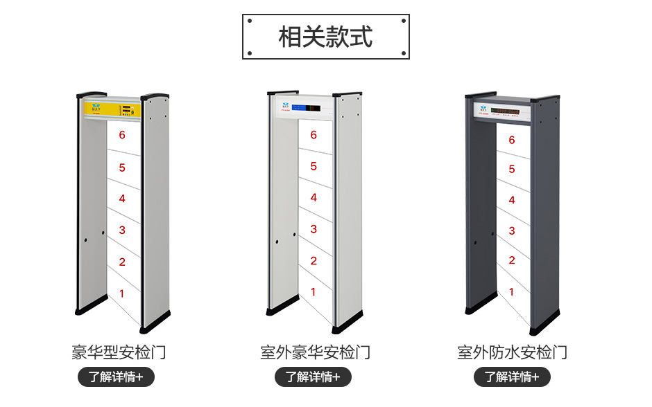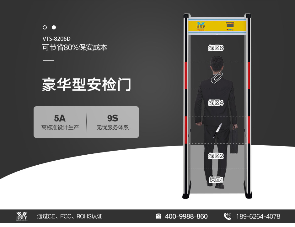 探天下(Explore the world)VTS-8206D液晶顯示豪華型金屬探測(cè)門是目前國(guó)內(nèi)優(yōu)質(zhì)的6防區(qū)金屬探測(cè)安檢門,是昆山三迅電子科技有限公司根據(jù)國(guó)家公安部《GB 15210-2003 通過式金屬探測(cè)門通用技術(shù)規(guī)范》標(biāo)準(zhǔn)設(shè)計(jì)研制,于2005年在國(guó)內(nèi)外同步批量上市,廣泛應(yīng)用于國(guó)內(nèi)各大生產(chǎn)企業(yè)、公檢法、監(jiān)獄、體育館、娛樂會(huì)所、車站、碼頭等場(chǎng)所。