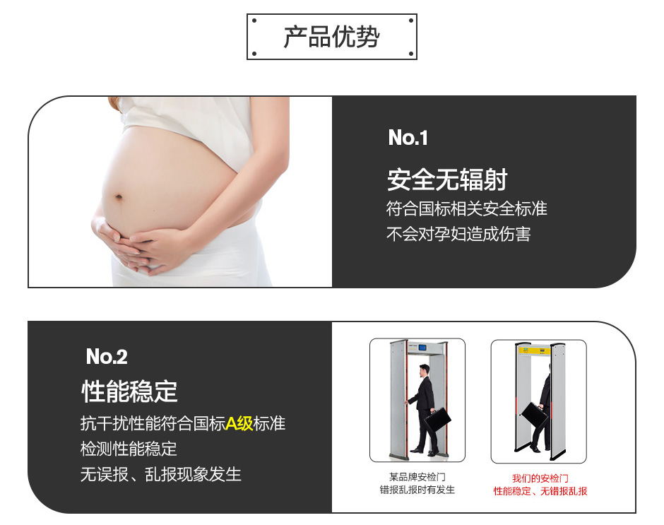 [防震設(shè)計(jì)]:防震設(shè)計(jì),站在安檢門的中間,用手拍兩側(cè)門板,安檢門不會(huì)誤報(bào)。